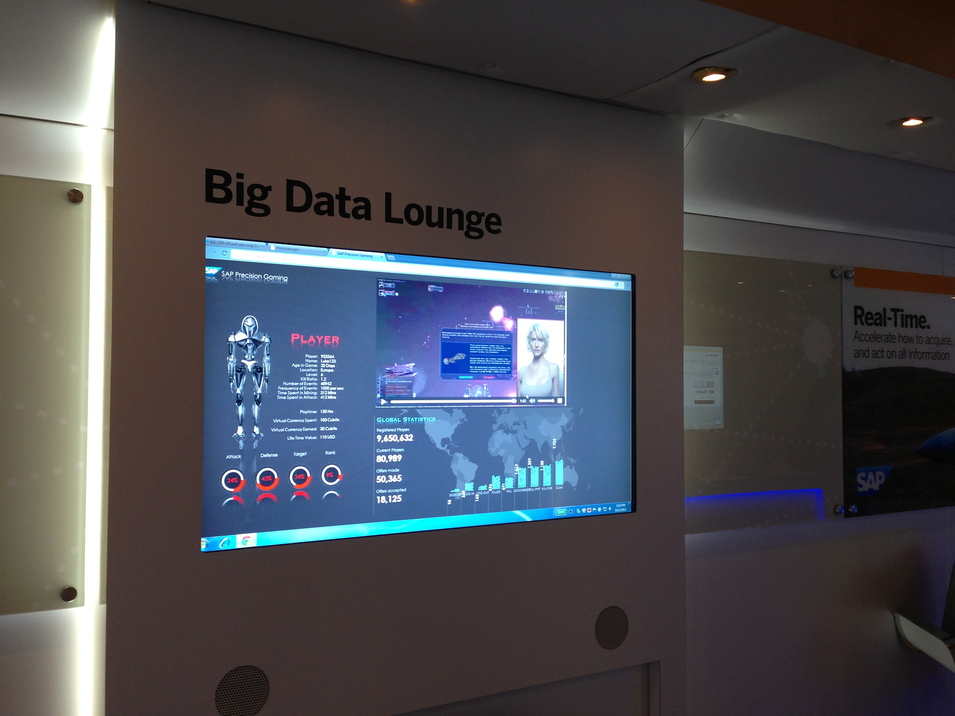 Using big screen display to present how the SAP HANA Big Data analysis power can help gaming companies to identify more personalized offer to their customers, thus improving the performance and loyalty of the players, and leveraging the profit of the company in a result.
