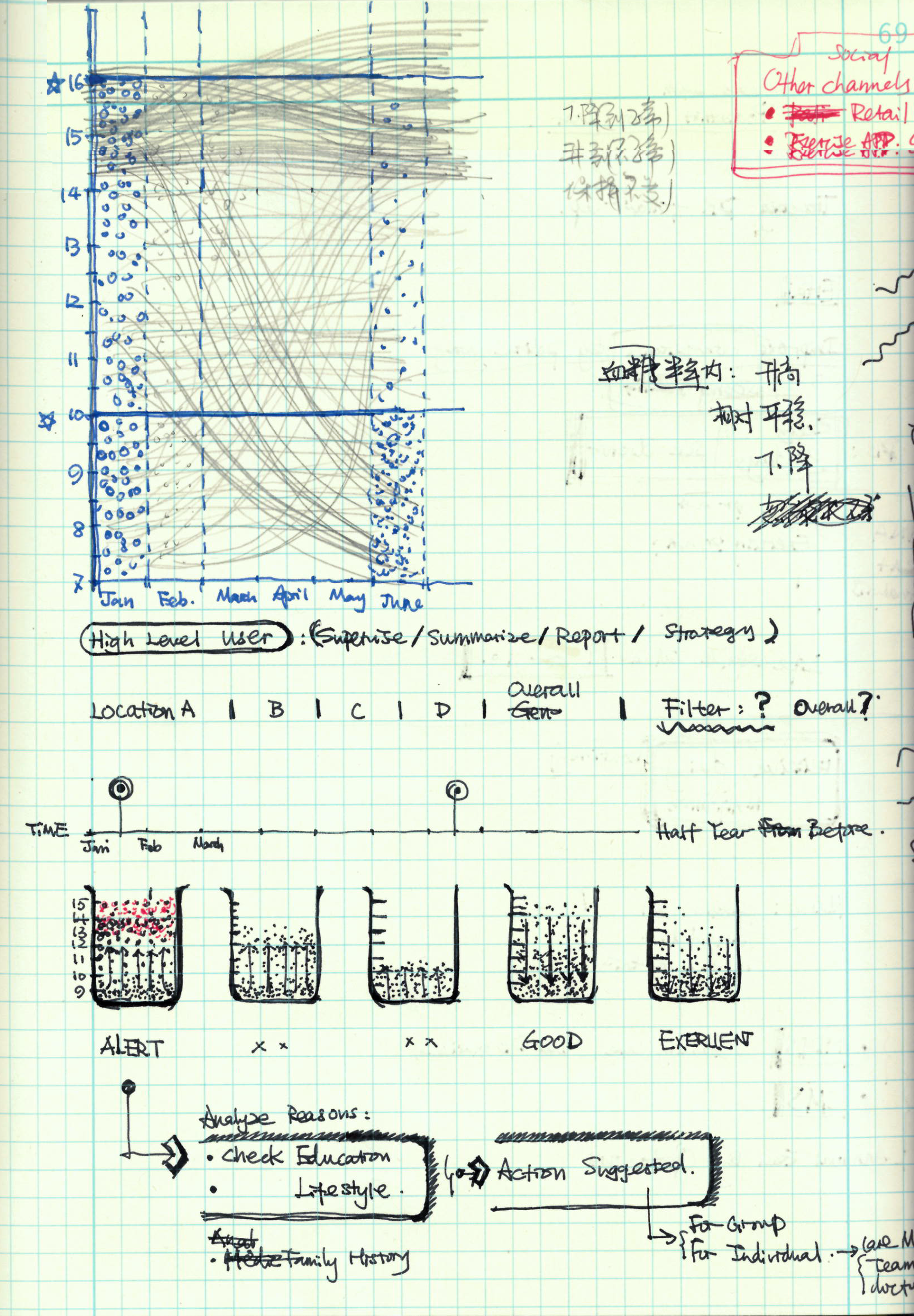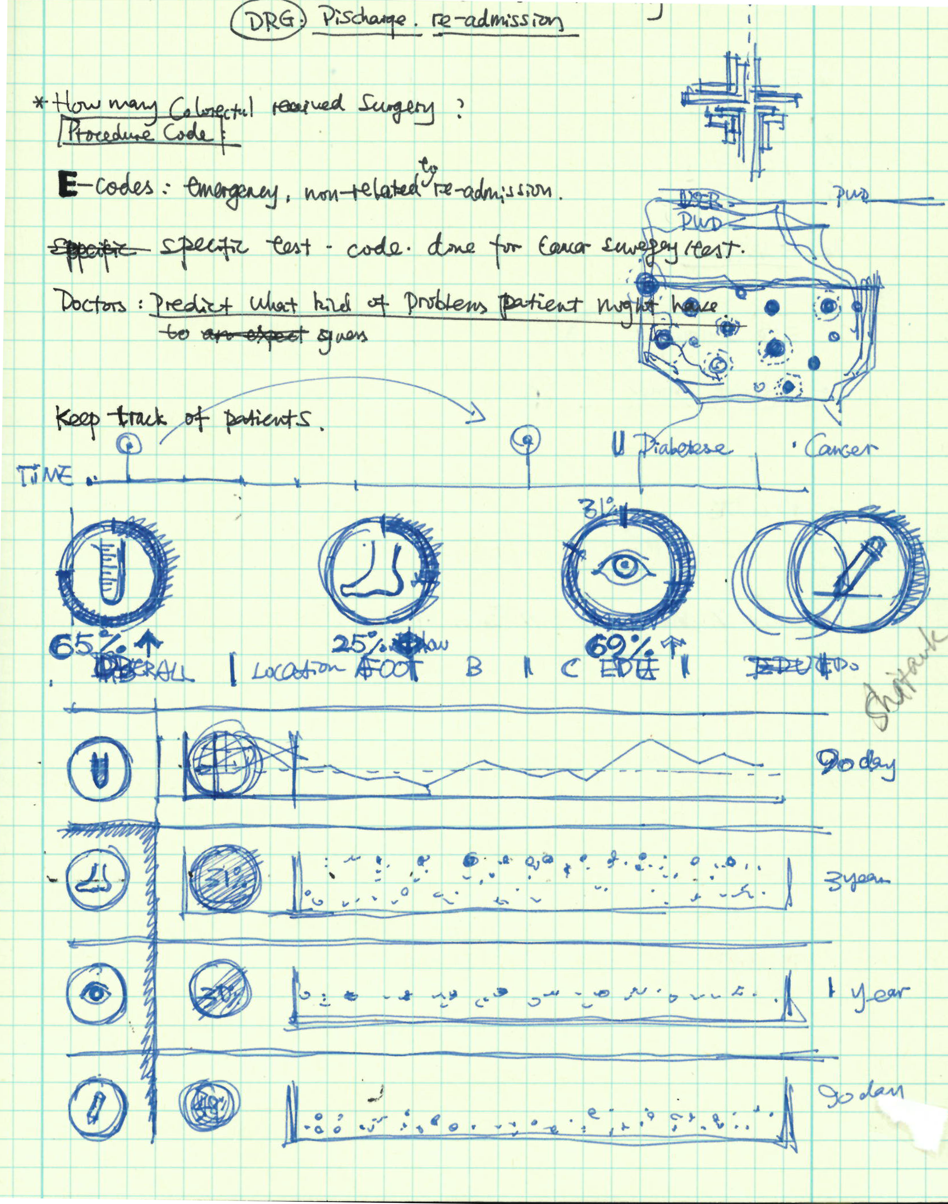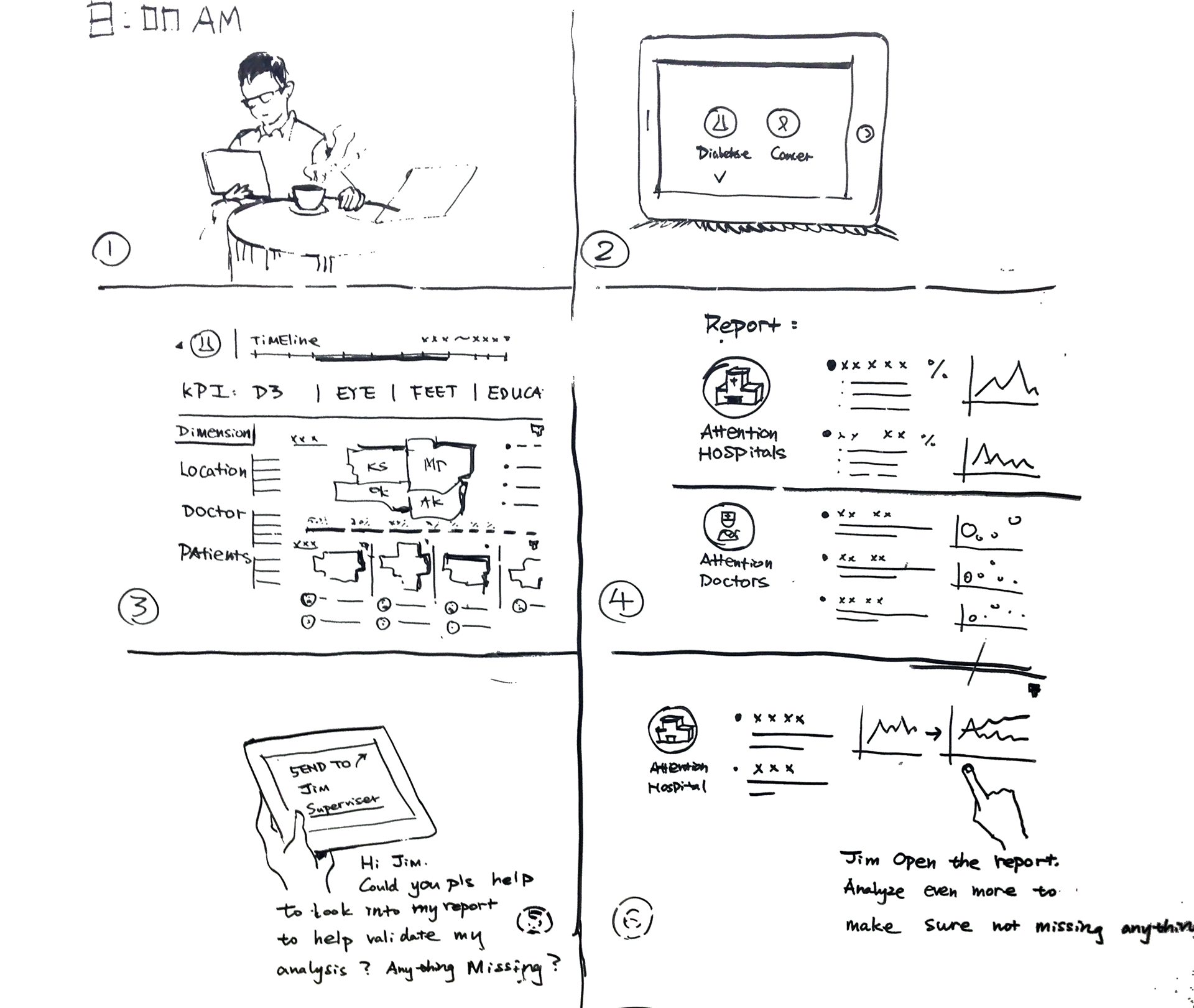 1. Clarify use case and create storyboard. The first phase of the design focused on Administrative officer, the person whose main tasks are: 1) Supervise the overall performance of Mercy hospitals and doctors – focusing on Diabetes and Cancer. 2) Give suggestions and insights to keep improving Mercy’s reputation. 3) Compare Mercy’s KPI with National benchmark and create related reports. 4) Supervise the overall medical service quality across the whole mercy group.